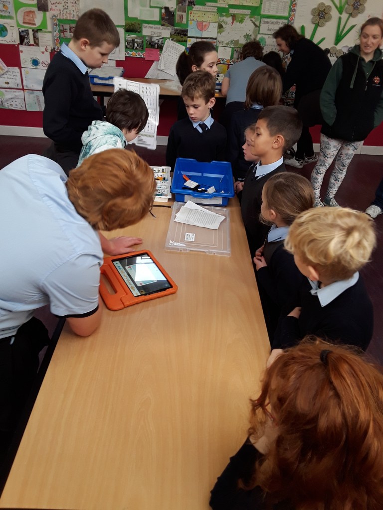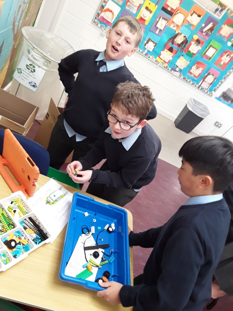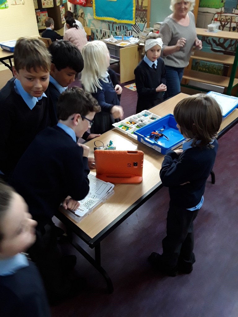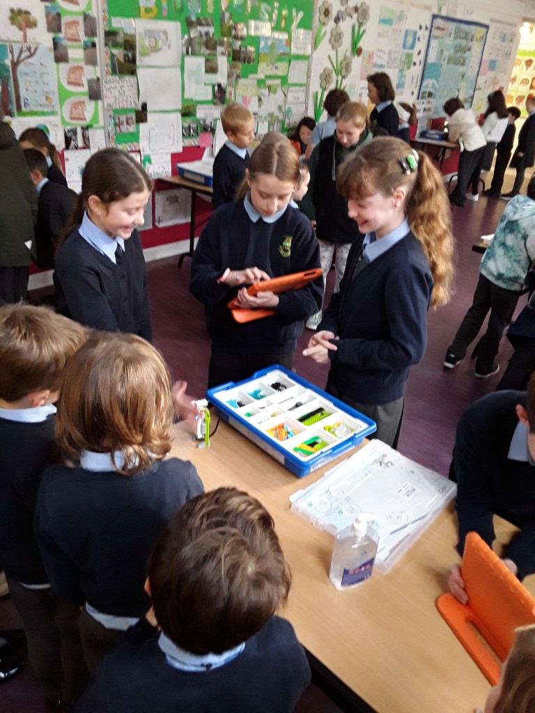 5th class working with the Lego WeDO 2.0 sets and showing their creations to 1st class.