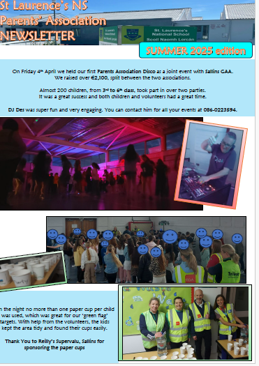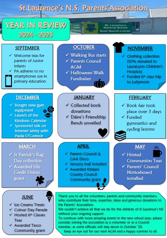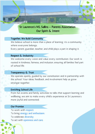 The St Laurence’s NS Parents Association is a volunteer group of parents and guardians working with the school to create a positive learning environment.